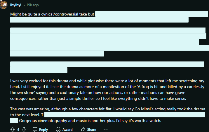 (번역) 시간 낭비였어, 너무 화가 났어. 시각적으로 드라마 전체가 멋진데 캐릭터, 줄거리, 장면을 전개하는 방식이 꽤나 피상적이고 엉성해. 불필요하게 길고 스토리에 아무런 요점도 제공하지 않는 멋진 장면이 너무 많아. 연기를 제외하면 눈에 띄는 게 없어. 미스터리 스릴러 분위기를 추구한 건 알지만 4회에 걸쳐 말도 안 되는 장면과 극적인 음악(아무 이유 없이)이 섞인 후에는 더 이상 미스터리가 아니야. 그냥 답답할 뿐이야. 각 캐릭터의 행동 뒤에 숨은 동기도 제대로 확립되지 않았거나 구체적으로 표현되지 않았어. 그냥 나쁜 드라마일 뿐이야, 미안해. 실행에 있어서는 야심적이었지만 몹시 부족했어.